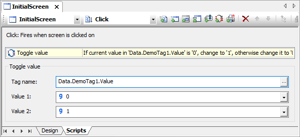 Allows toggling a Tag value. If the Tag value is equal to Value1, then the Tag receives Value2. If the Tag value is equal to Value2, then the Tag receives Value1. If the Tag value is different from either Value1 or Value2, then the Tag receives Value1.