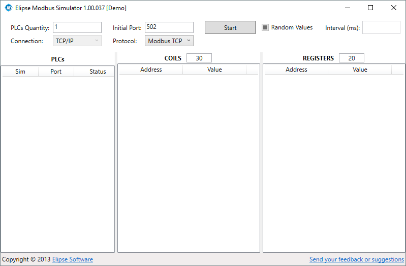 Elipse Modbus Simulator is a generator of random values for applications compatible with Modbus RTU and Modbus TCP protocols. In addition, it also allows receiving writing messages performed by these applications. This program can be downloaded at Elipse Software's website.