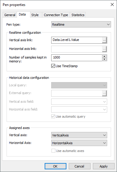 A Pen Collection object represents a set of Pens contained on an E3Chart. Each Pen is configured to display data according to the configuration executed on the Data tab of the Properties Window. On Pens tab, users can configure the number and type of Pens to create in Pens Collection. Select this tab and click Add