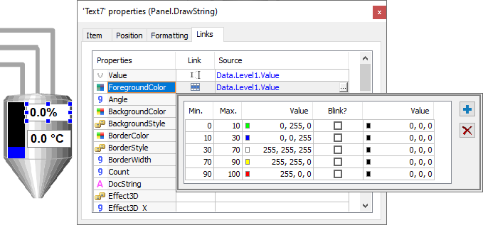 1.In Display's ForegroundColor property, insert a Table Connection to the Level1 Tag.