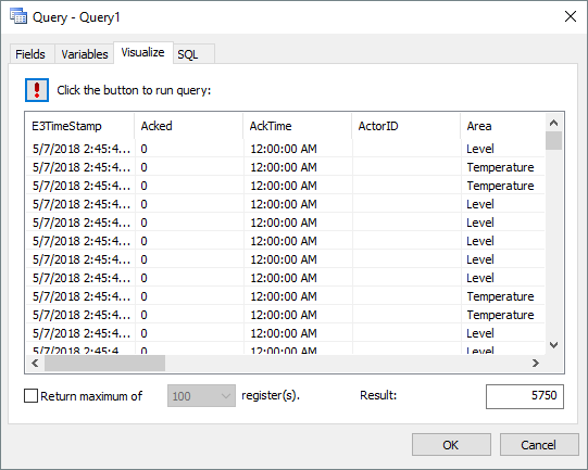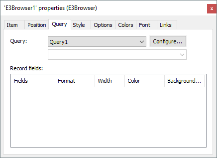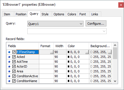 10.Click OK. After finishing this step, all fields listed on the Query are available in this E3Browser. Configure each field with a color, a format, and a size.
