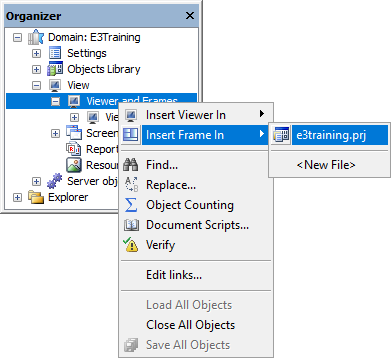 1.Right-click the Viewer and Frames item and select the Insert Frame in - E3Training.prj option.