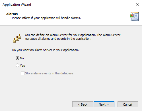 8.Answer No to the question Do you want an Alarm Server in your application?. This subject is addressed in a further chapter.