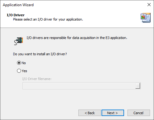 6.Answer No to the question Do you want to install an I/O Driver?. This subject is addressed in a further chapter.