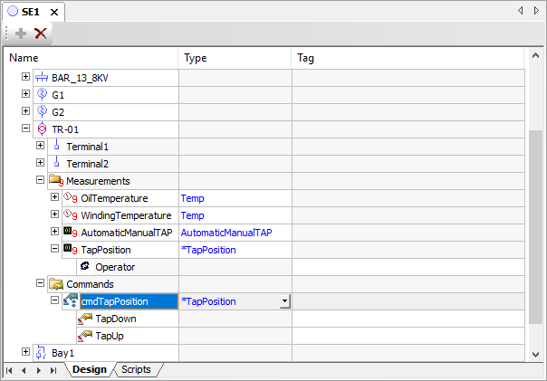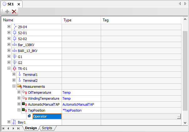 7.On Tag column, link the Operator source of Measurement TapPosition with the expression "SE1.[TR-01].Terminal1.TapPosition.Operator", by using AppBrowser. This expression is the same for both Units.